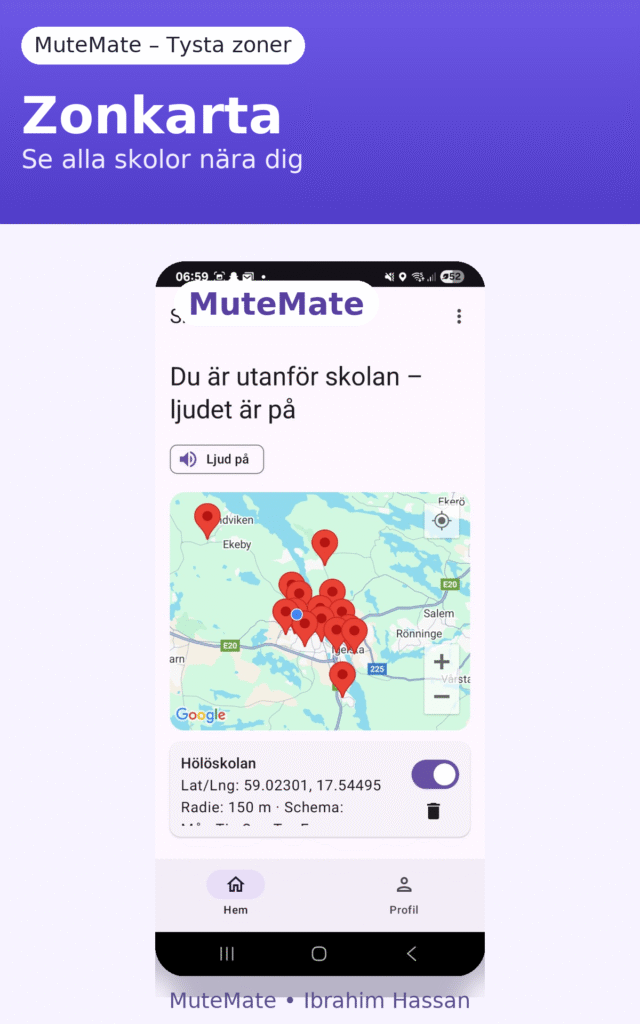 MuteMate automatically switches your phone to silent mode in defined zones to minimize distractions and improve focus.